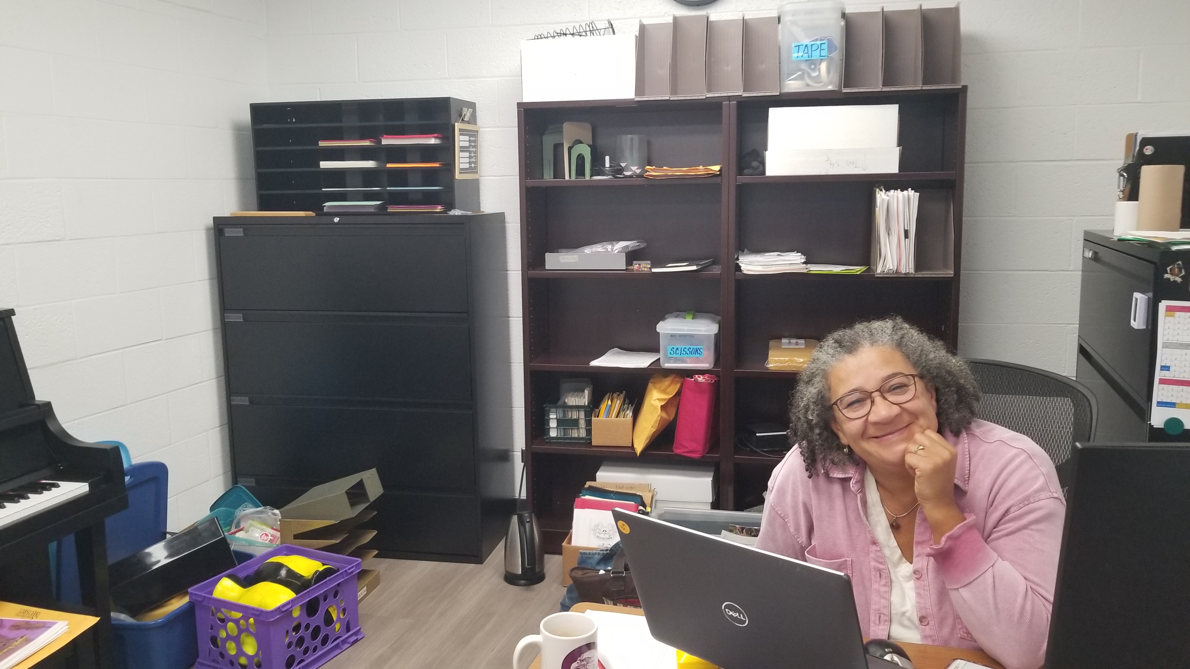 This is Ms. Pierce's office! Even though it doesn't look the most organized, the chaos contains a piano, a work desk, and more!